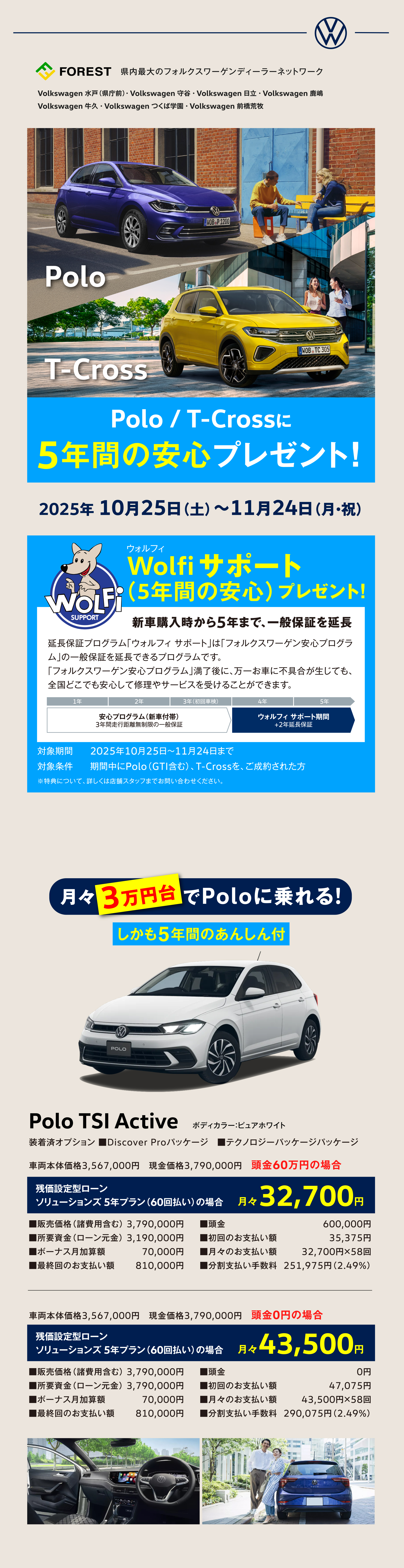 Polo / T-Crossに5年間の安心プレゼント SHOWROOM Volkswagen 水戸(県庁前) Volkswagen 守谷 Volkswagen 日立 Volkswagen 鹿嶋 Volkswagen 牛久 Volkswagen つくば学園 Volkswagen 前橋荒牧 Volkswagen 古河 認定中古車センター