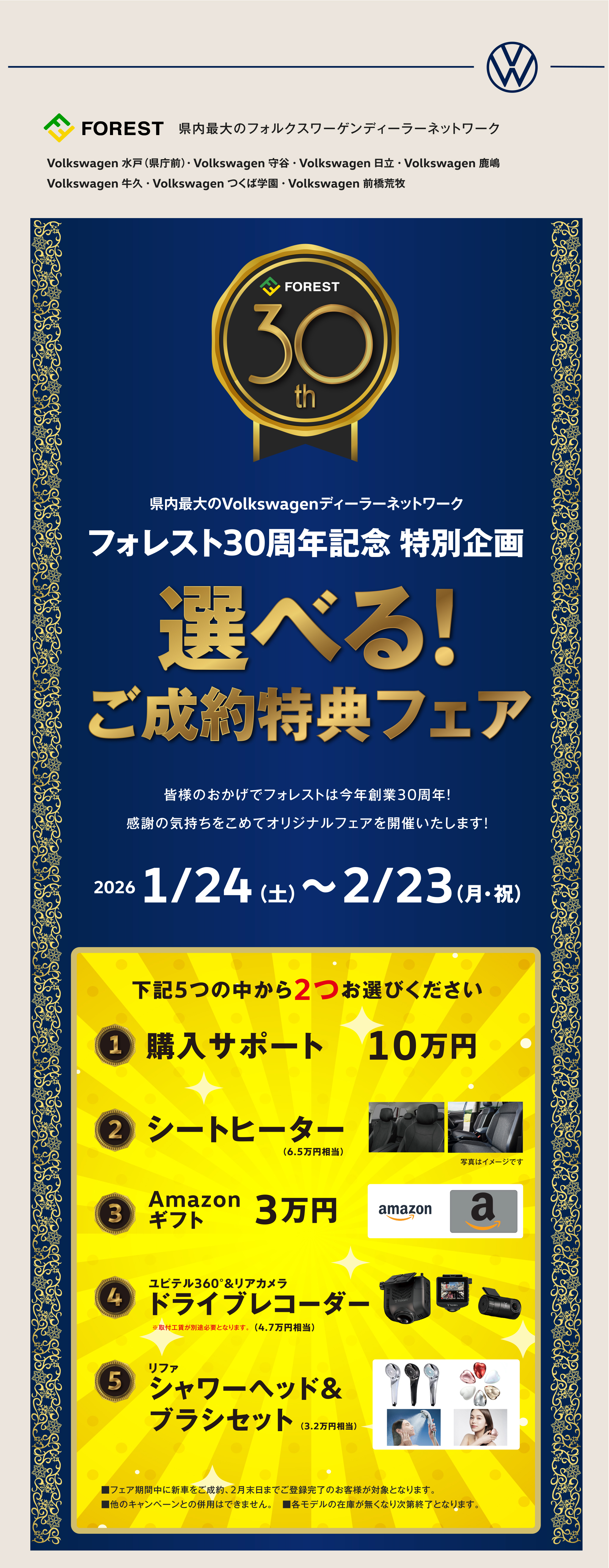 選べるご成約特典フェア SHOWROOM Volkswagen 水戸(県庁前) Volkswagen 守谷 Volkswagen 日立 Volkswagen 鹿嶋 Volkswagen 牛久 Volkswagen つくば学園 Volkswagen 前橋荒牧 Volkswagen 古河 認定中古車センター
